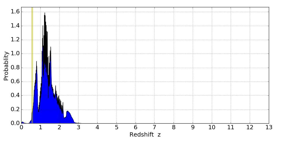 In P(z) plots: Yellow lines mark the cluster redshift z = 0.566,