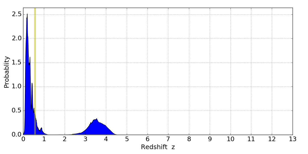In P(z) plots: Yellow lines mark the cluster redshift z = 0.566,