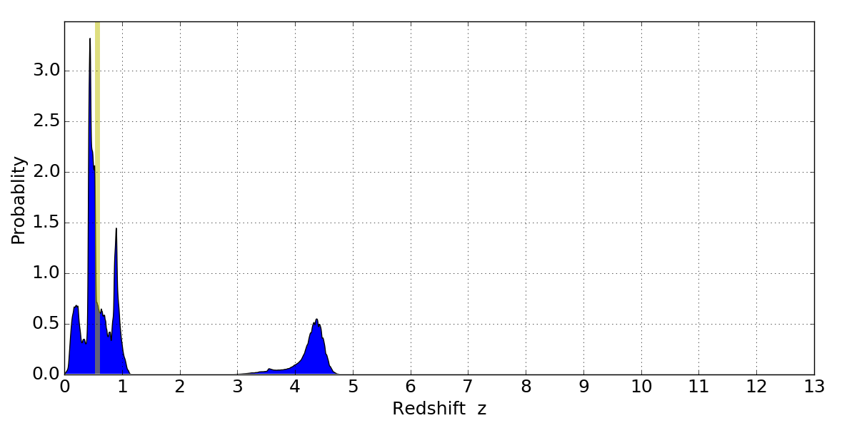 In P(z) plots: Yellow lines mark the cluster redshift z = 0.566,