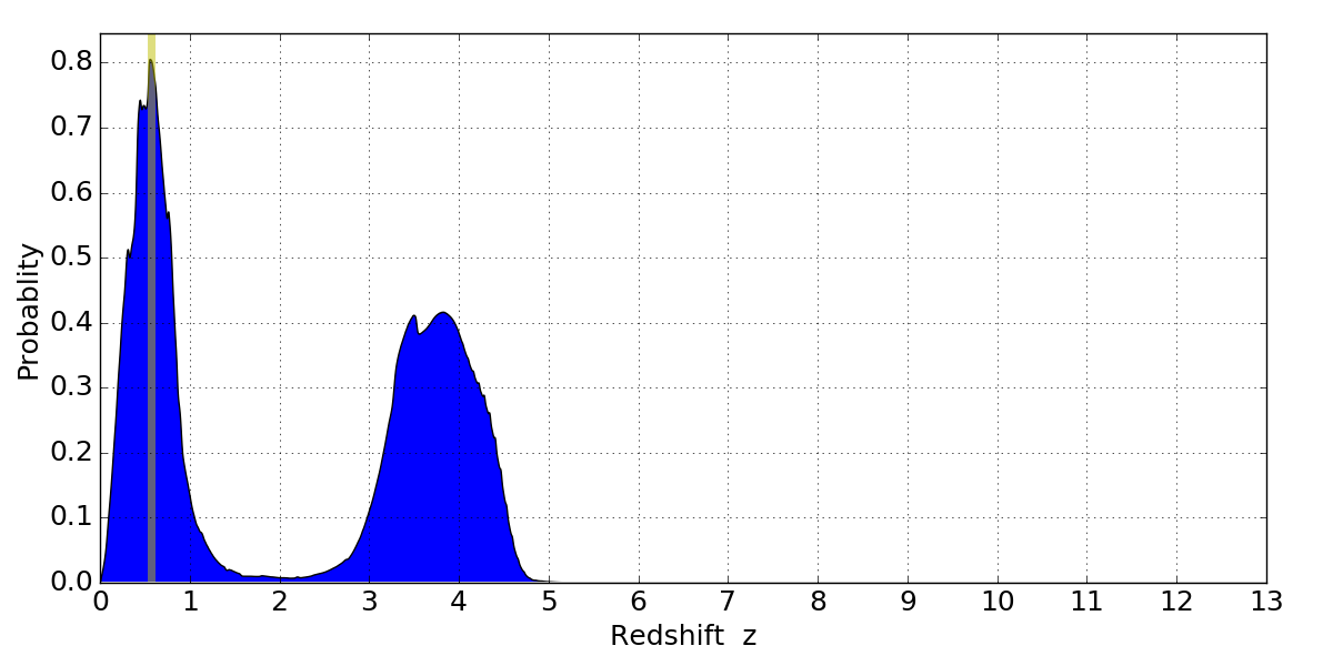 In P(z) plots: Yellow lines mark the cluster redshift z = 0.566,