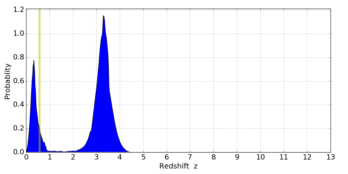 In P(z) plots: Yellow lines mark the cluster redshift z = 0.566,