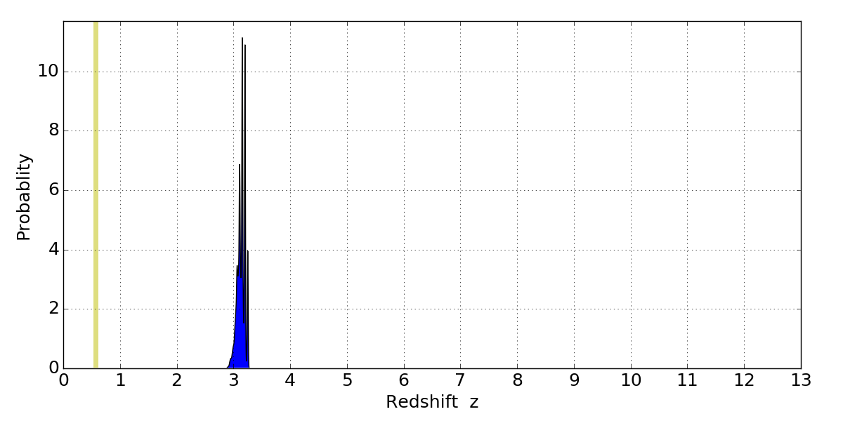 In P(z) plots: Yellow lines mark the cluster redshift z = 0.566,