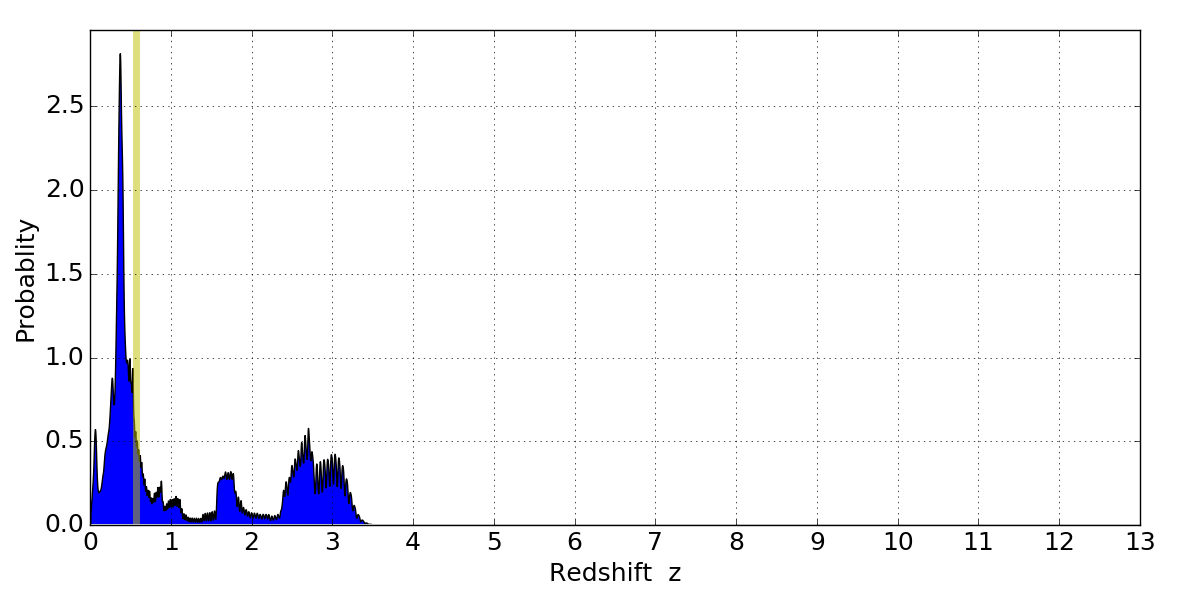 In P(z) plots: Yellow lines mark the cluster redshift z = 0.566,