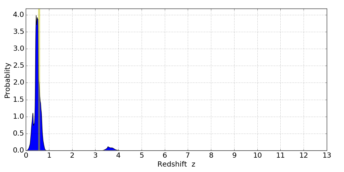 In P(z) plots: Yellow lines mark the cluster redshift z = 0.566,