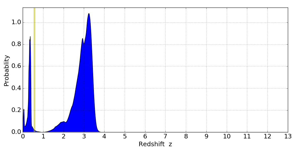 In P(z) plots: Yellow lines mark the cluster redshift z = 0.566,
