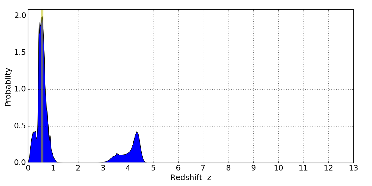In P(z) plots: Yellow lines mark the cluster redshift z = 0.566,