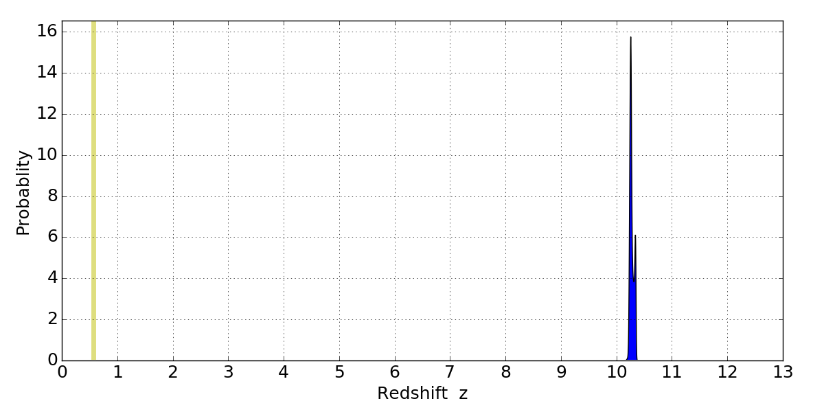 In P(z) plots: Yellow lines mark the cluster redshift z = 0.566,