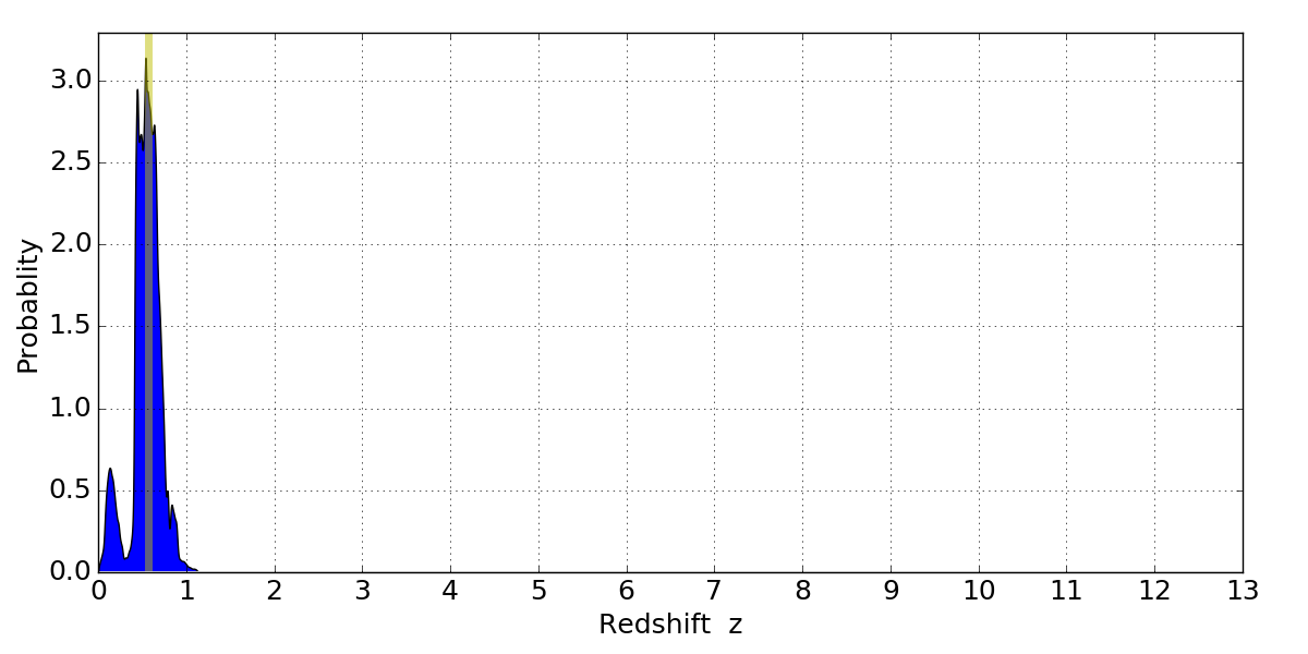 In P(z) plots: Yellow lines mark the cluster redshift z = 0.566,