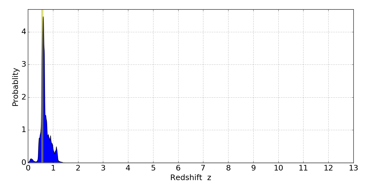 In P(z) plots: Yellow lines mark the cluster redshift z = 0.566,