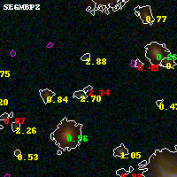 Black segments are analyzed here. Roll mouse over color images to view segments. Best viewed in a wide browser window (1200 pixels or more). Download SED & P(z) plots to view larger versions.