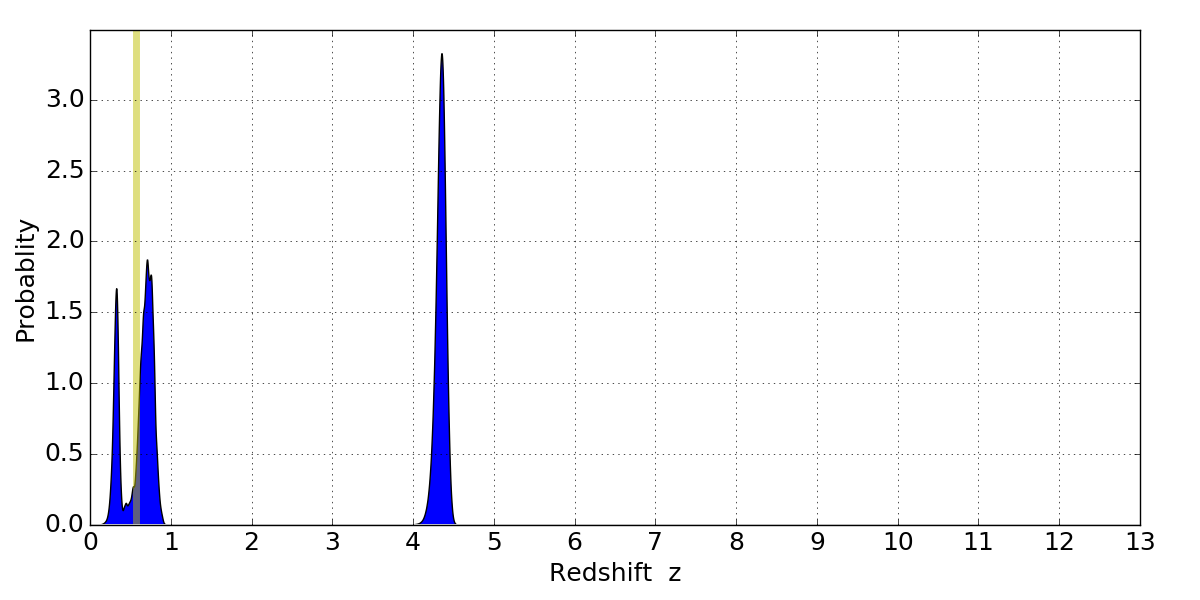 In P(z) plots: Yellow lines mark the cluster redshift z = 0.566,