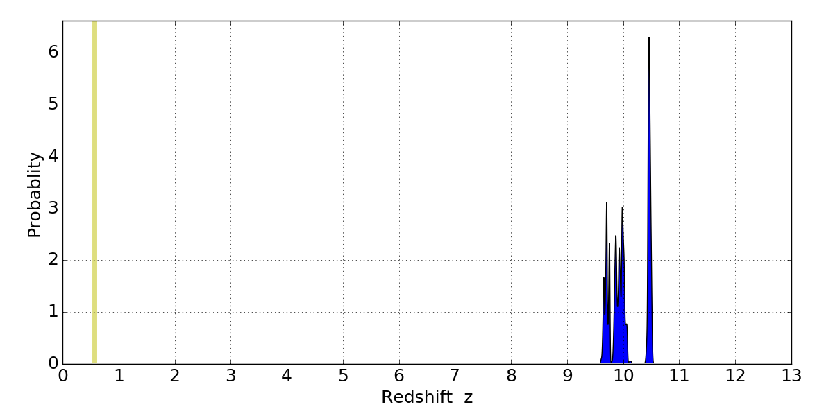 In P(z) plots: Yellow lines mark the cluster redshift z = 0.566,