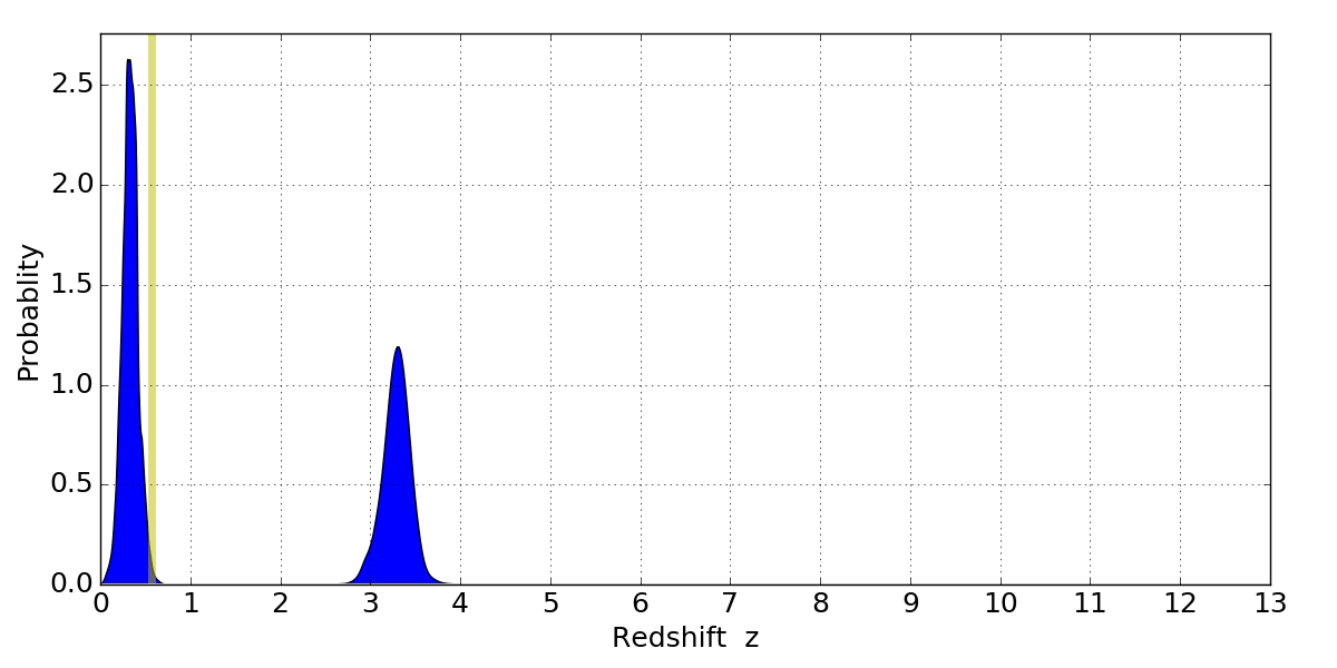 In P(z) plots: Yellow lines mark the cluster redshift z = 0.566,