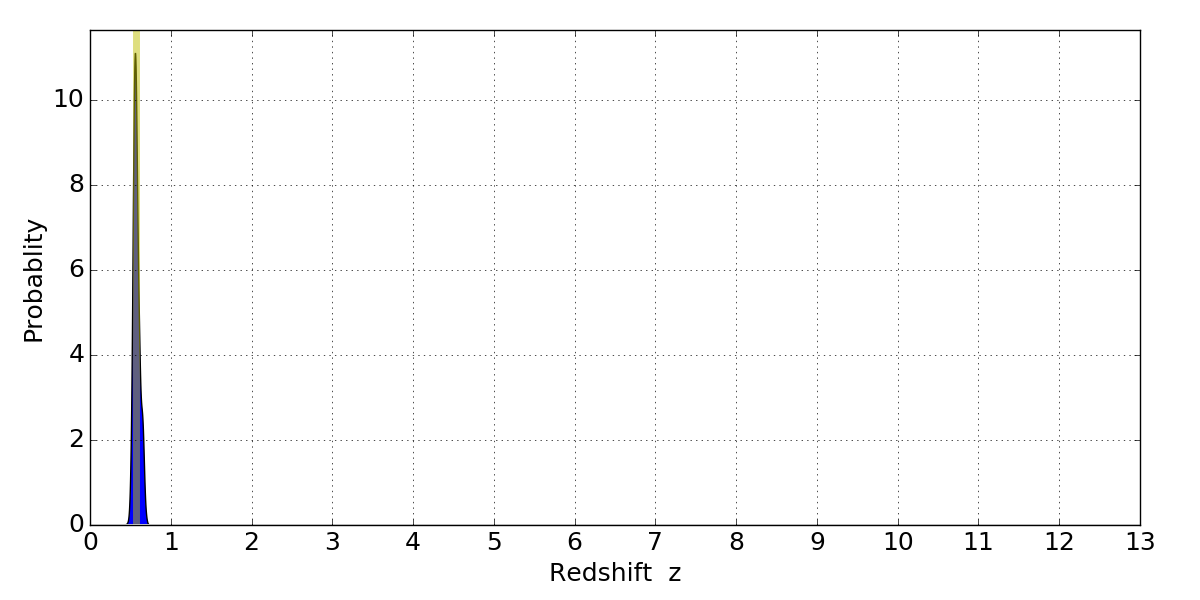 In P(z) plots: Yellow lines mark the cluster redshift z = 0.566,