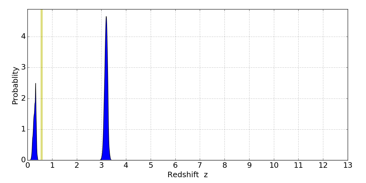In P(z) plots: Yellow lines mark the cluster redshift z = 0.566,