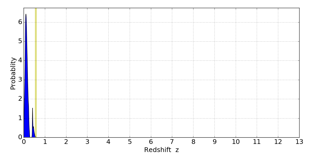 In P(z) plots: Yellow lines mark the cluster redshift z = 0.566,