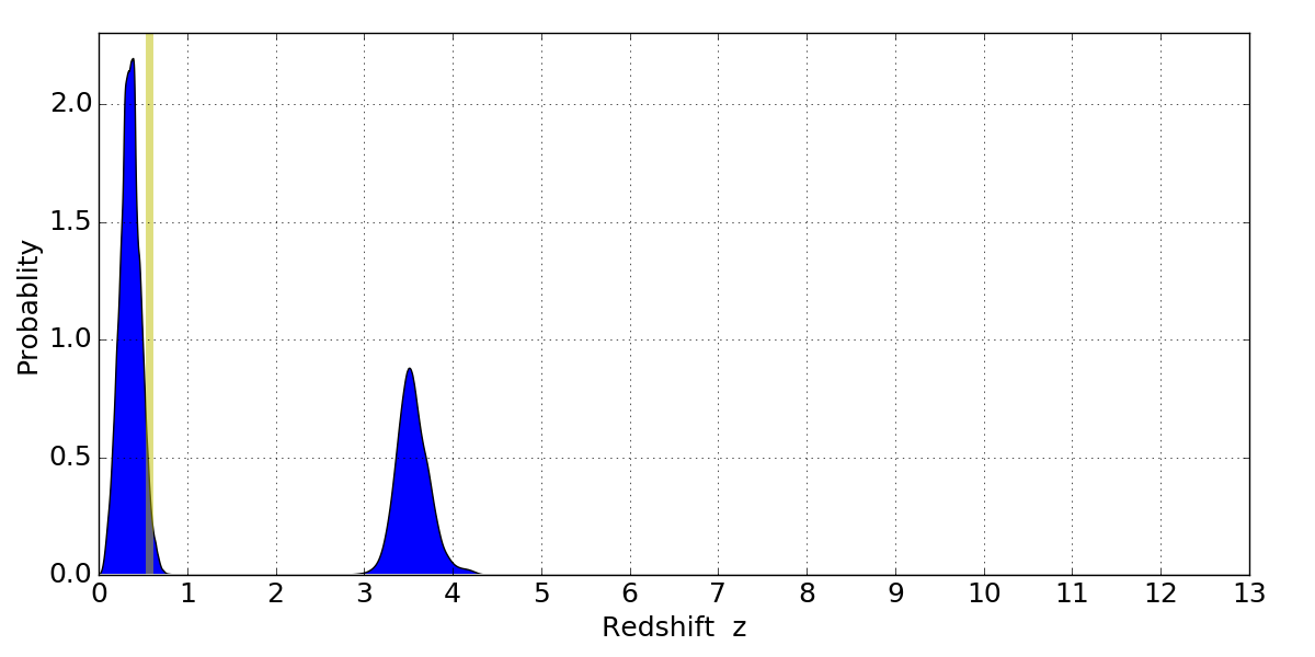 In P(z) plots: Yellow lines mark the cluster redshift z = 0.566,