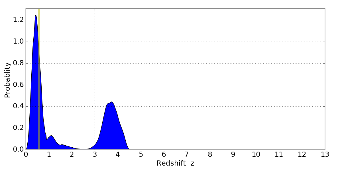 In P(z) plots: Yellow lines mark the cluster redshift z = 0.566,