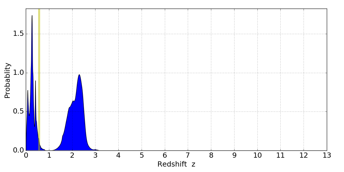 In P(z) plots: Yellow lines mark the cluster redshift z = 0.566,