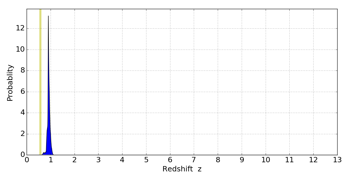 In P(z) plots: Yellow lines mark the cluster redshift z = 0.566,