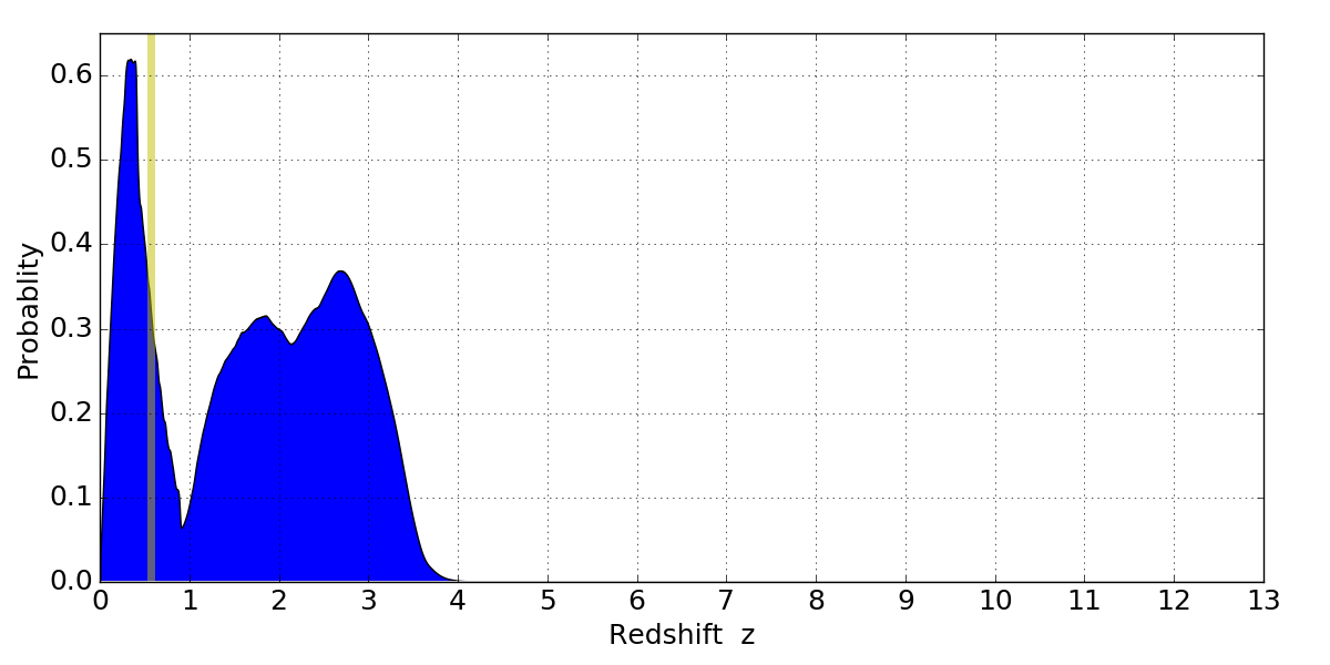 In P(z) plots: Yellow lines mark the cluster redshift z = 0.566,