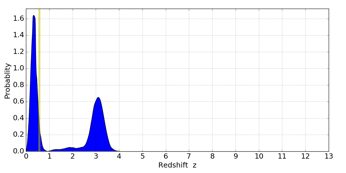 In P(z) plots: Yellow lines mark the cluster redshift z = 0.566,