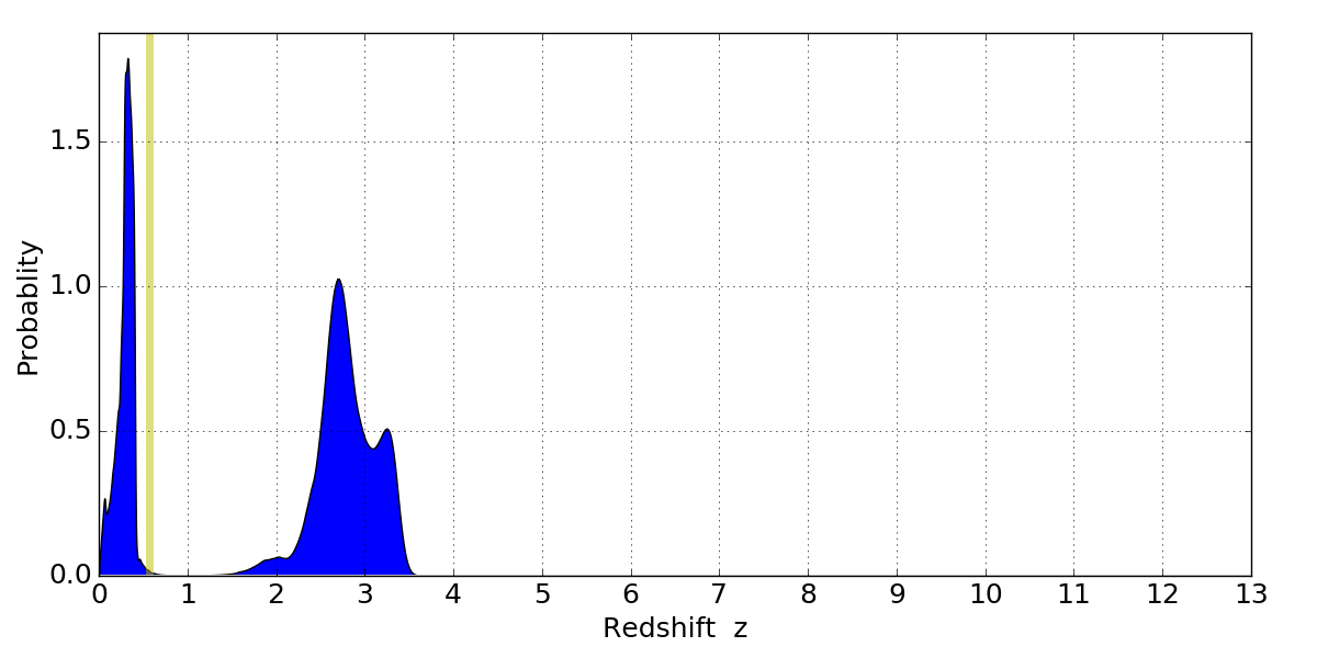 In P(z) plots: Yellow lines mark the cluster redshift z = 0.566,