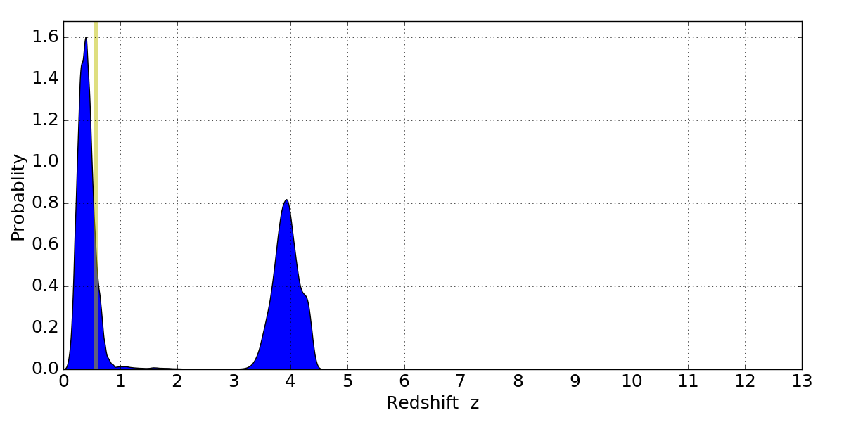 In P(z) plots: Yellow lines mark the cluster redshift z = 0.566,
