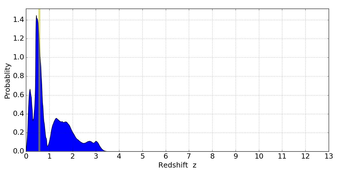 In P(z) plots: Yellow lines mark the cluster redshift z = 0.566,