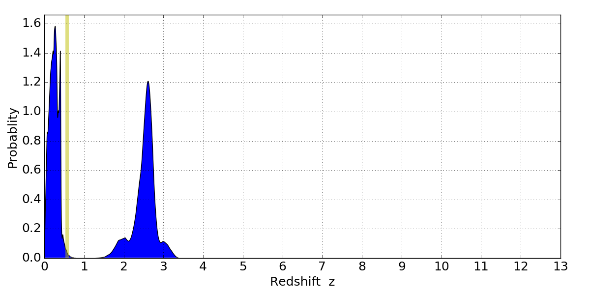 In P(z) plots: Yellow lines mark the cluster redshift z = 0.566,