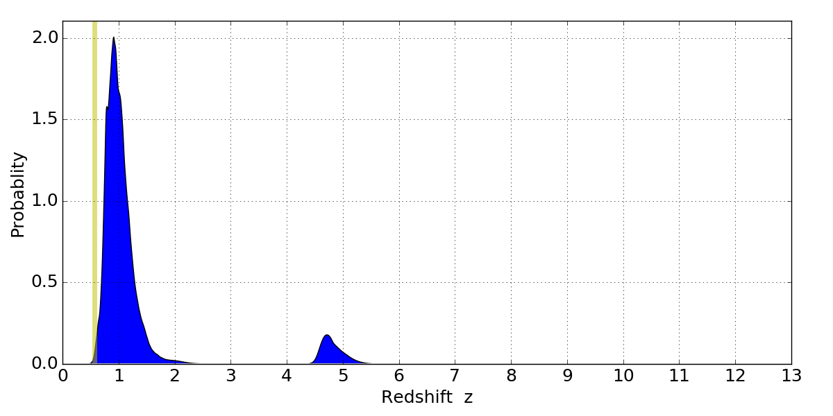 In P(z) plots: Yellow lines mark the cluster redshift z = 0.566,