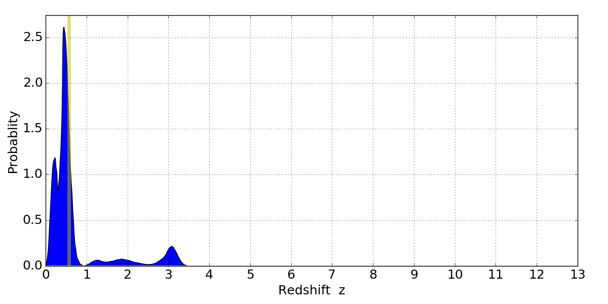 In P(z) plots: Yellow lines mark the cluster redshift z = 0.566,