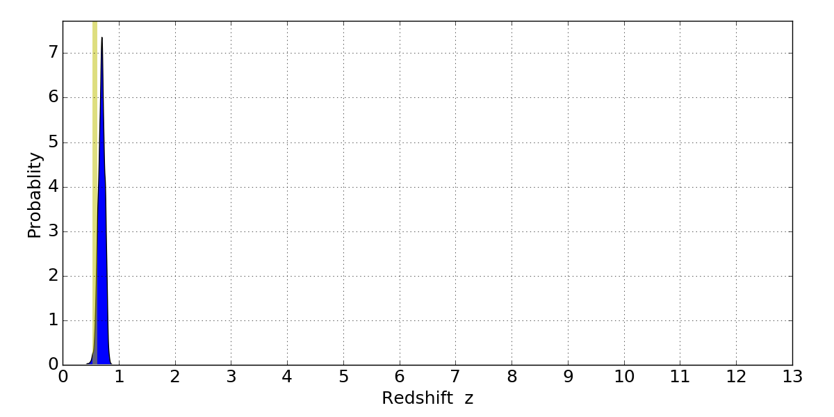 In P(z) plots: Yellow lines mark the cluster redshift z = 0.566,