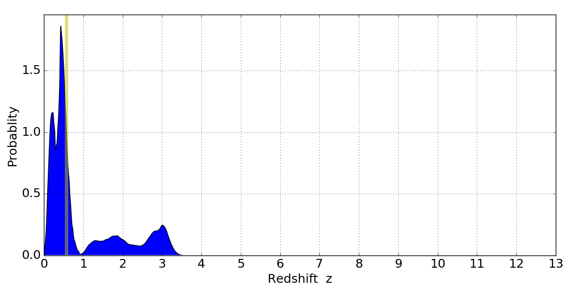 In P(z) plots: Yellow lines mark the cluster redshift z = 0.566,