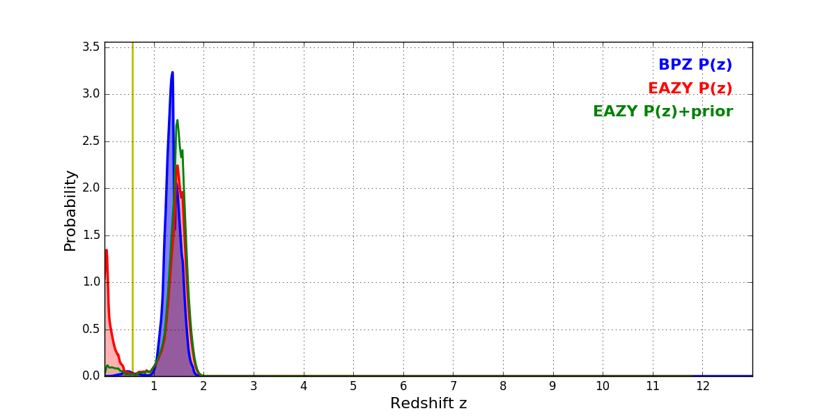 In P(z) plots: Yellow lines mark the cluster redshift z = 0.566,