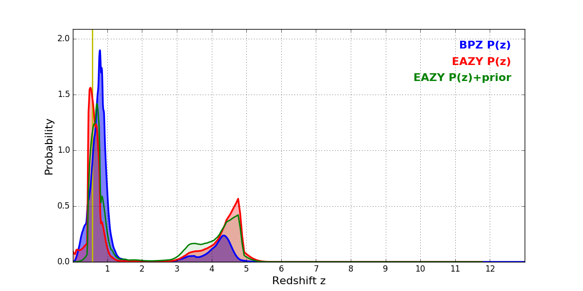 In P(z) plots: Yellow lines mark the cluster redshift z = 0.566,