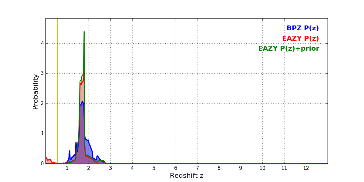 In P(z) plots: Yellow lines mark the cluster redshift z = 0.566,