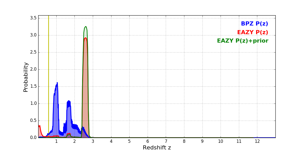 In P(z) plots: Yellow lines mark the cluster redshift z = 0.566,