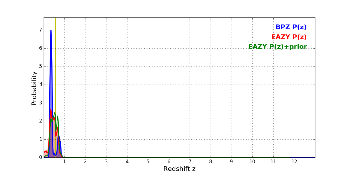 In P(z) plots: Yellow lines mark the cluster redshift z = 0.566,