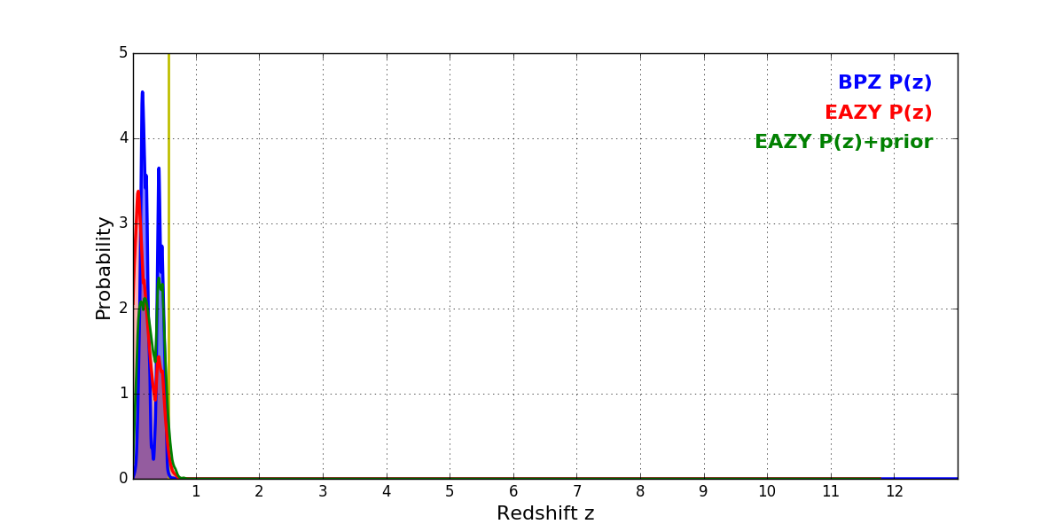 In P(z) plots: Yellow lines mark the cluster redshift z = 0.566,