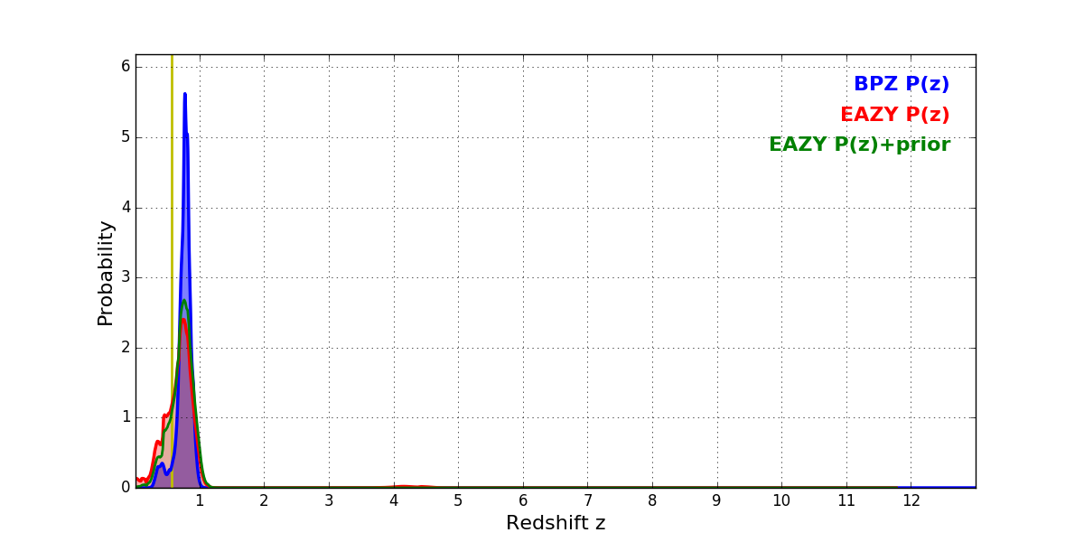 In P(z) plots: Yellow lines mark the cluster redshift z = 0.566,