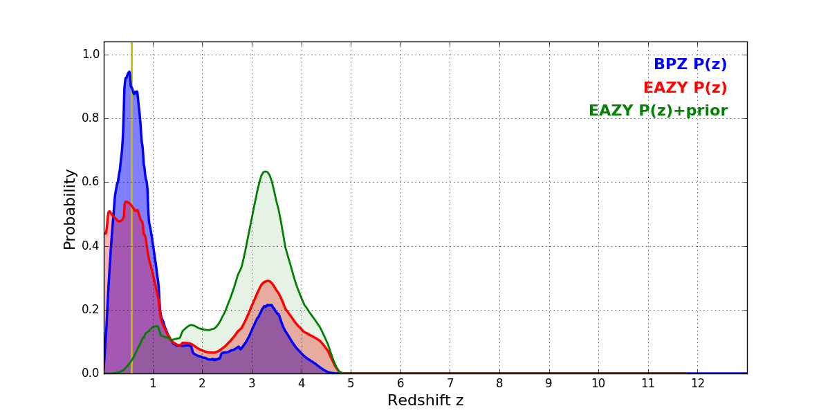 In P(z) plots: Yellow lines mark the cluster redshift z = 0.566,