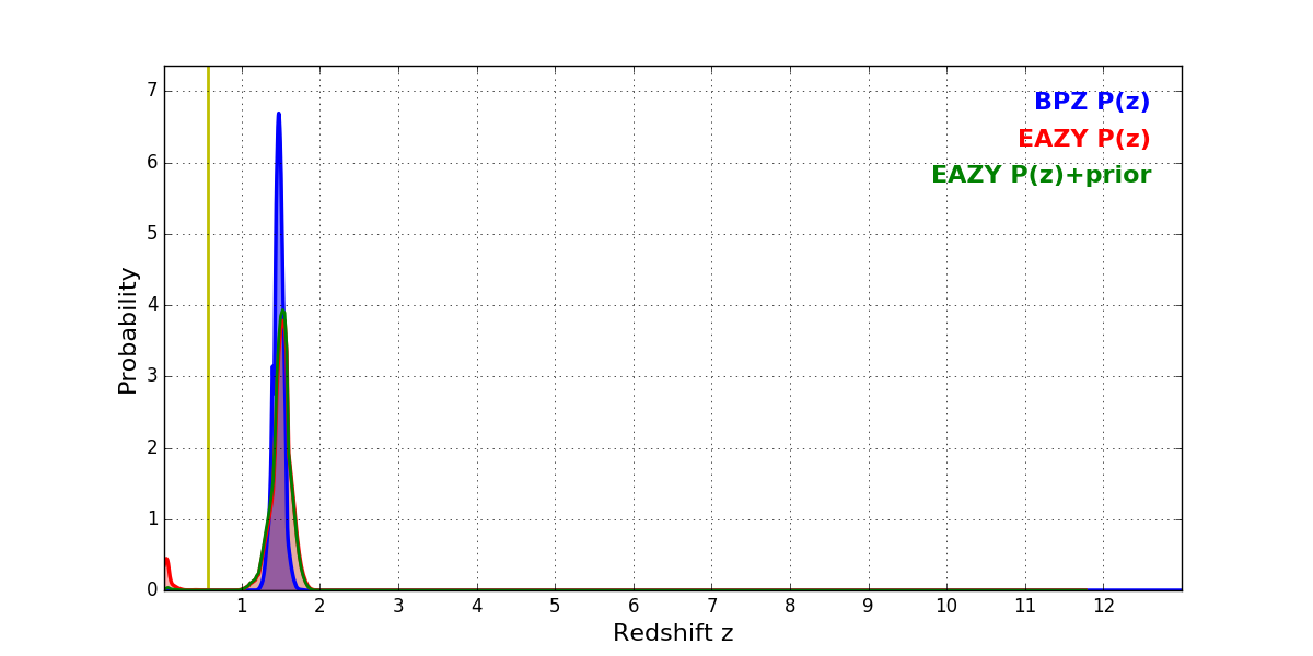 In P(z) plots: Yellow lines mark the cluster redshift z = 0.566,