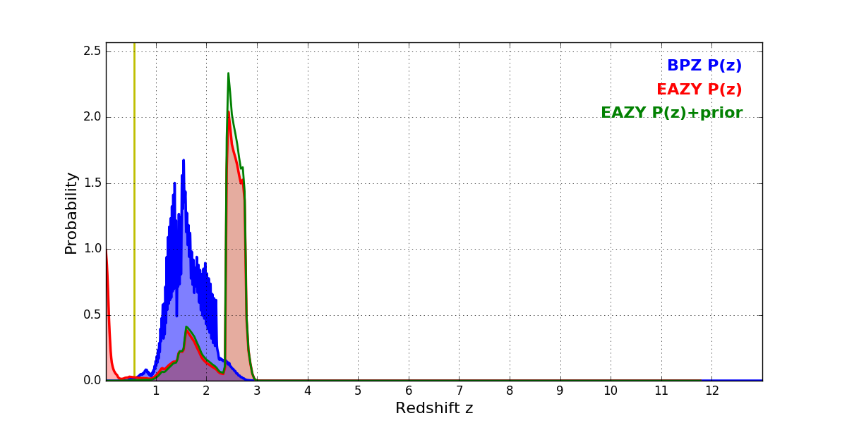 In P(z) plots: Yellow lines mark the cluster redshift z = 0.566,