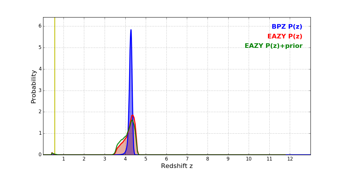 In P(z) plots: Yellow lines mark the cluster redshift z = 0.566,