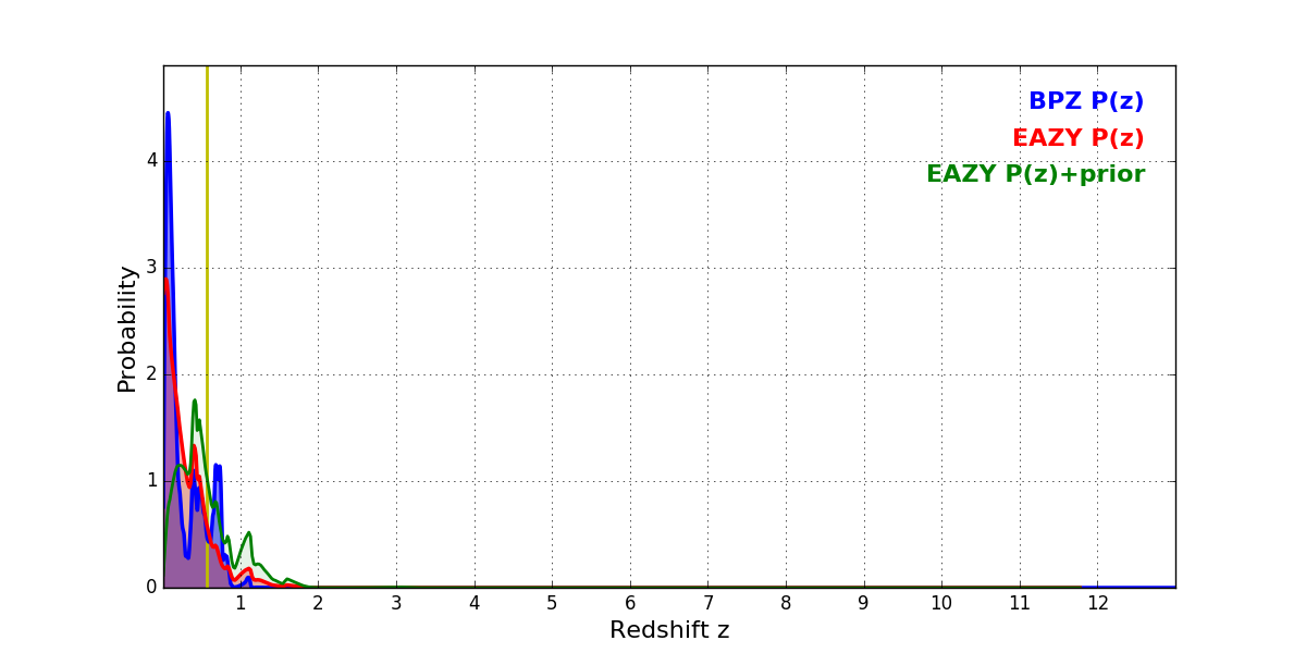 In P(z) plots: Yellow lines mark the cluster redshift z = 0.566,