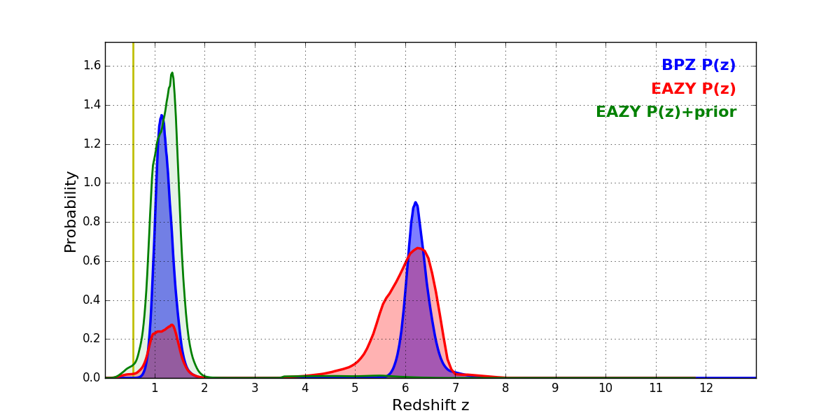 In P(z) plots: Yellow lines mark the cluster redshift z = 0.566,
