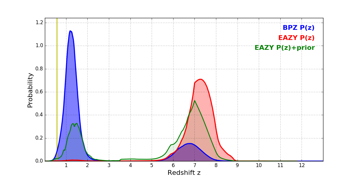 In P(z) plots: Yellow lines mark the cluster redshift z = 0.566,