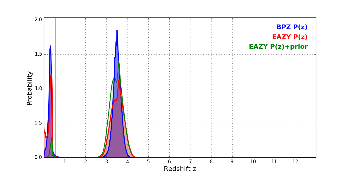In P(z) plots: Yellow lines mark the cluster redshift z = 0.566,