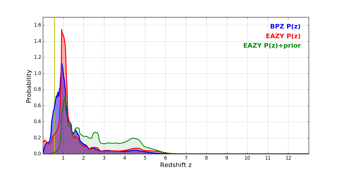 In P(z) plots: Yellow lines mark the cluster redshift z = 0.566,